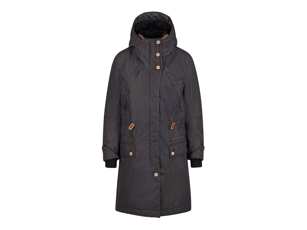 Kabát má zapínanie na zips doplnené o veternú légu, ktorá zvyšuje ochranu proti chladu. Praktické riešenie vreciek zahŕňa bočné šikmé vrecká aj našité vrecká so zapínaním na gombík, ktoré ponúkajú dostatok priestoru na drobnosti. Nechýbajú ani vnútorné vrecká pre bezpečné uloženie cenností.