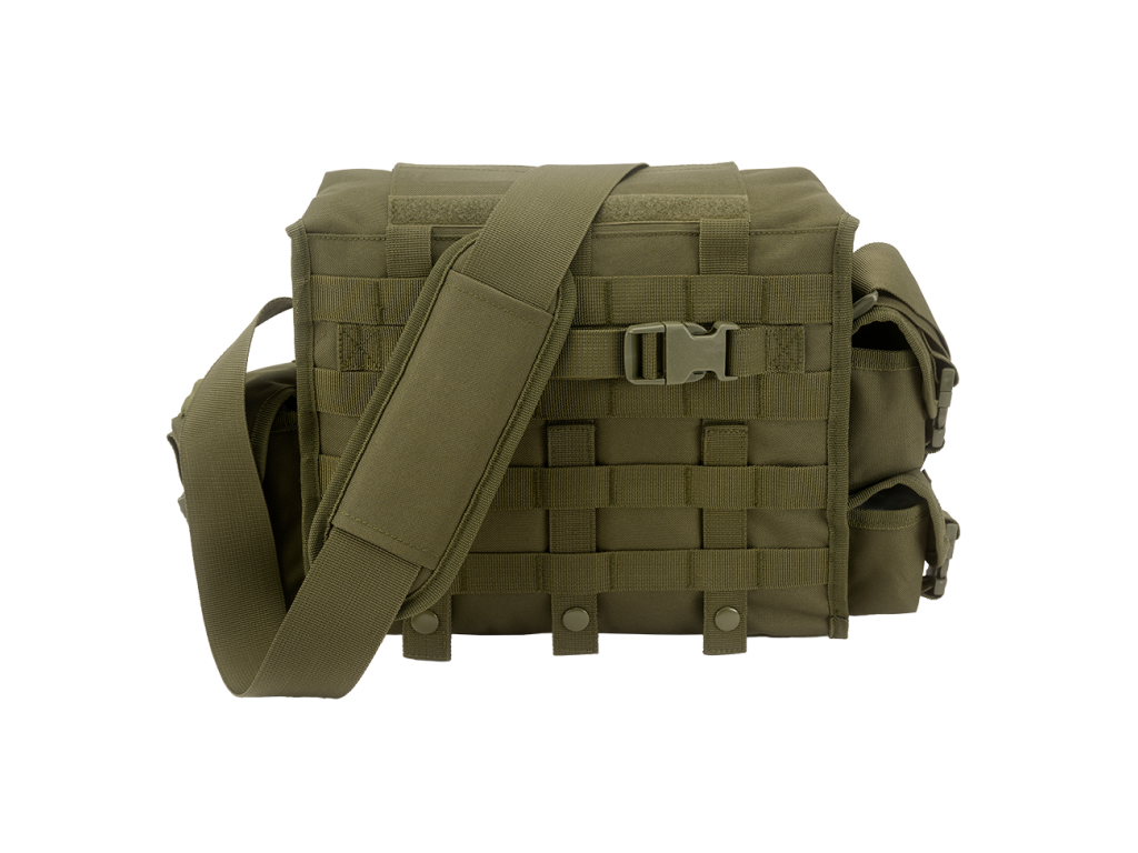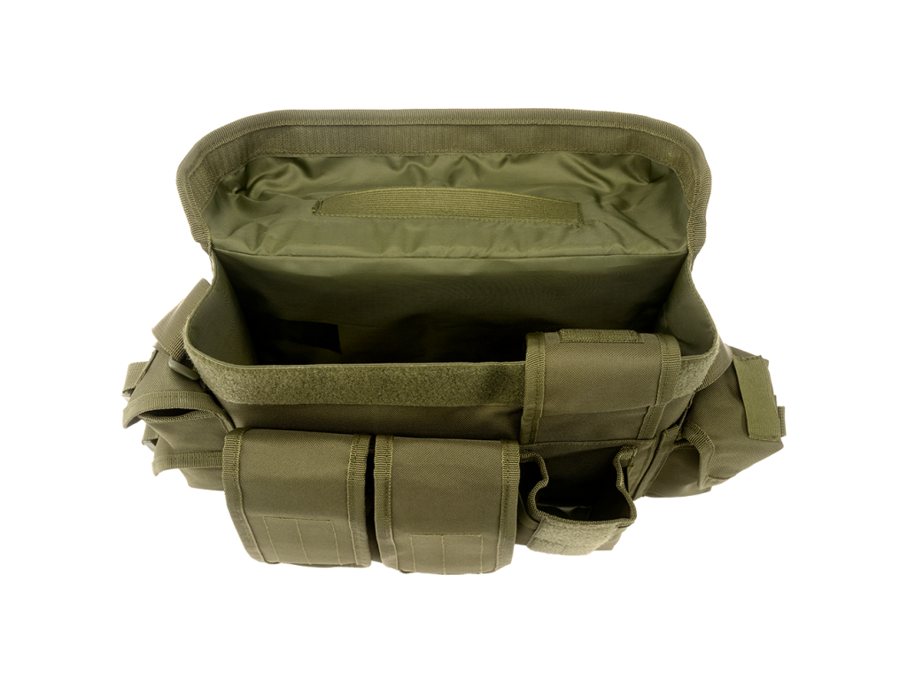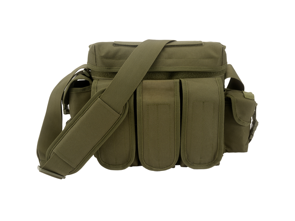 multifunctional bag made of 600D polyester / 1 large main compartment / practical quick access via bag lid / Velcro fastener / 3 front pockets with Velcro fastener / 3 small side pockets with Velcro fastener and additional clip fastener / adjustable shoulder strap with padded shoulder pad / Molle system / adjustable compression strap