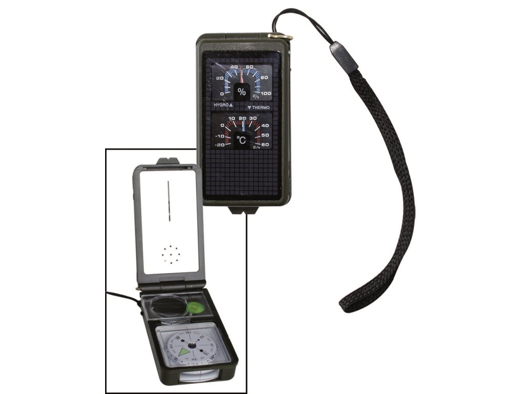 Malý, kompaktný kompas s 10 funkciami: - meranie teploty - meranie vlhkosti - optický hľadáčik - zväčšovacie sklo - pravítko - kompas - Pitch určenie - LED svetlo - kresadlo - píšťalka