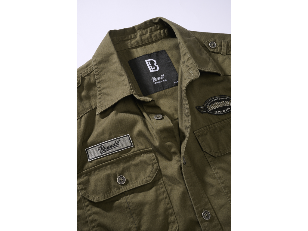 Klasický rovný strih, epolety na pleciach a dve náprsné vrecká so zapínaním na gombíky zabezpečujú praktické využitie. Košeľa je doplnená o tri výrazné výšivky, ktoré jej dodávajú autentický army vzhľad.