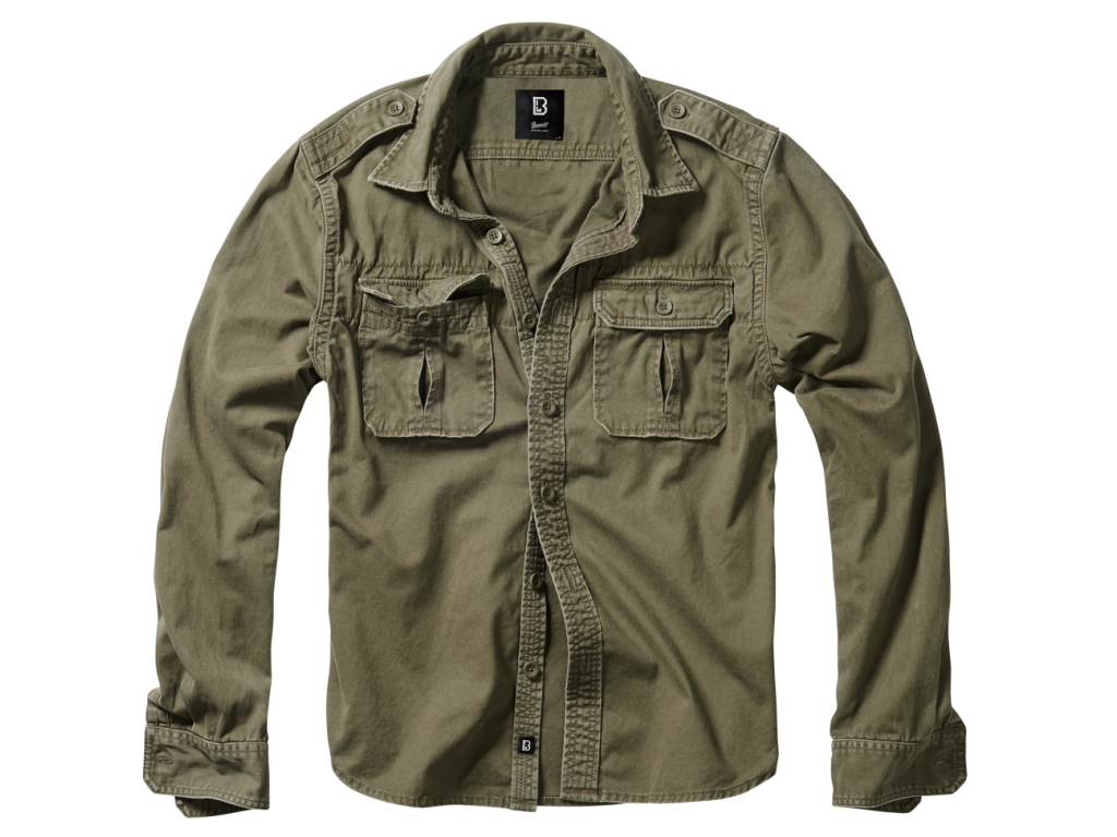 Pánska košeľa Brandit Vintage Shirt s dlhým rukávom v army štýle. Vyrobená z kvalitnej bavlny s vintage úpravou a autentickými detailmi, ako sú ramenné výložky a jemne ošúchané okraje pre typický vintage vzhľad.