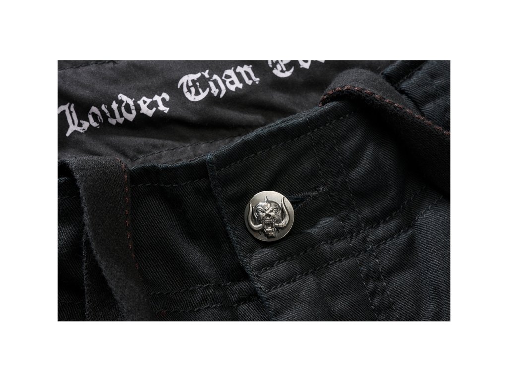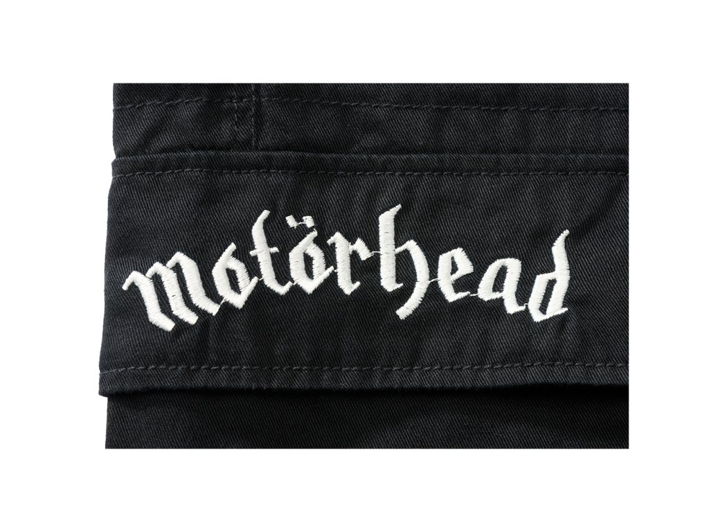 Na ľavej strane sa nachádza výrazná 3D potlač Warpig – ikonický symbol kapely Motörhead, doplnený o vyšívané logo Motörhead na pravom vrecku. Pás je nastaviteľný šnúrkou, vďaka čomu sa šortky pohodlne prispôsobia postave. Na koncoch nohavíc sú sťahovacie šnúrky, ktoré umožňujú upraviť tvar podľa štýlu.