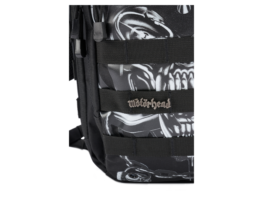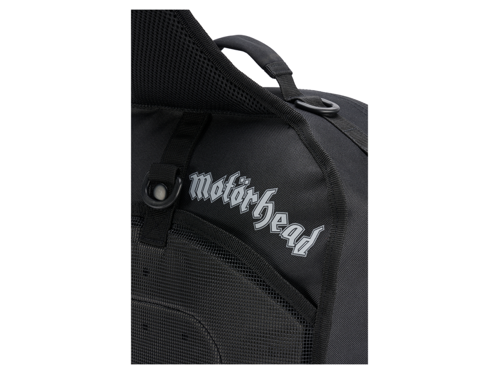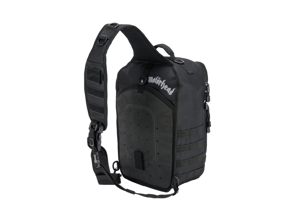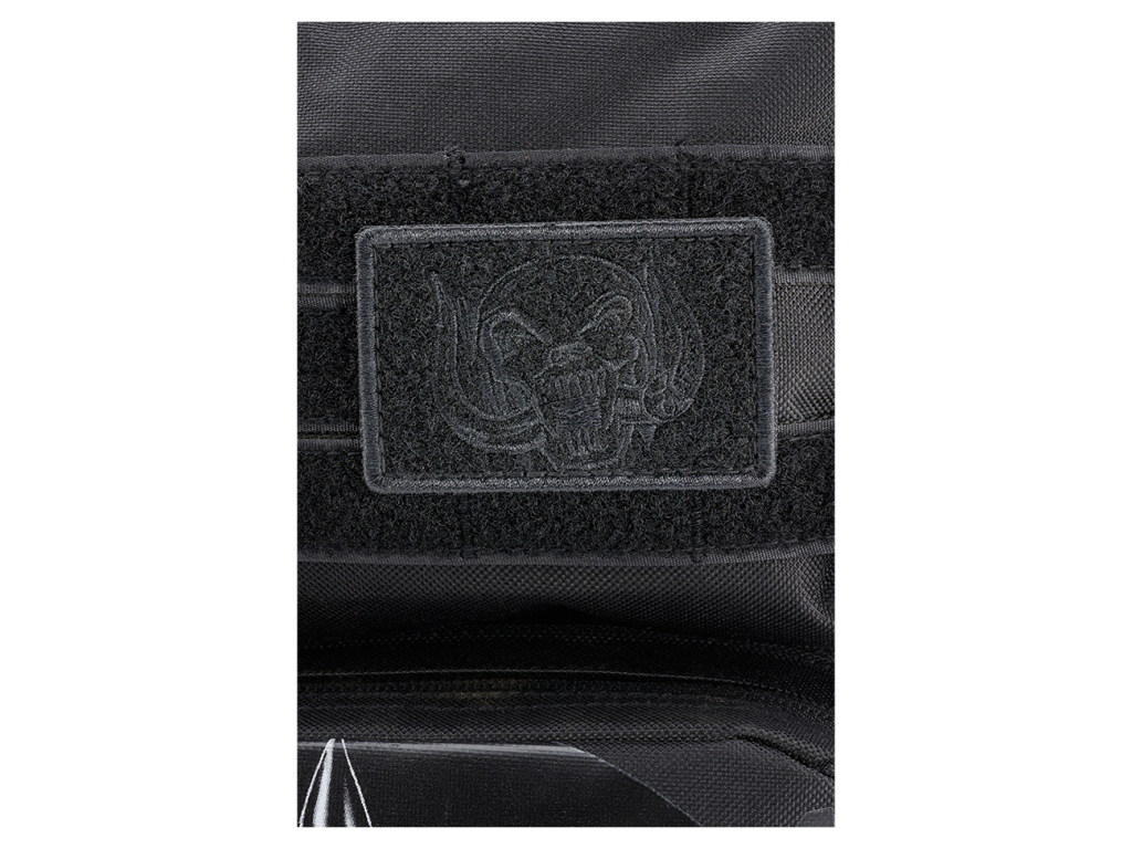 Warpig print on the front / Motörhead lettering on the back / two removable patches on the hook and loop area / removable Motörhead metal pin / shoulderstrap with: Motörhead patch / anti-slip effect / large Quick Release closure / padding and breathable Mesh / smartphone-pocket (max. 8 x 16 cm) / D-rings and molle for additional equipment / length-adjustment with additional elastic-straps / backpack with: / organizer / molle system / documents compartment / 2 attached pockets / inner compartment for passports etc. / hook and loop pad for patches / padded handle / reversal zipper / backside pocket for tablet etc. (tablet max: 16 x 27 cm) / backside pocket with anti-slipping effect /backside pocket with belt-fixing