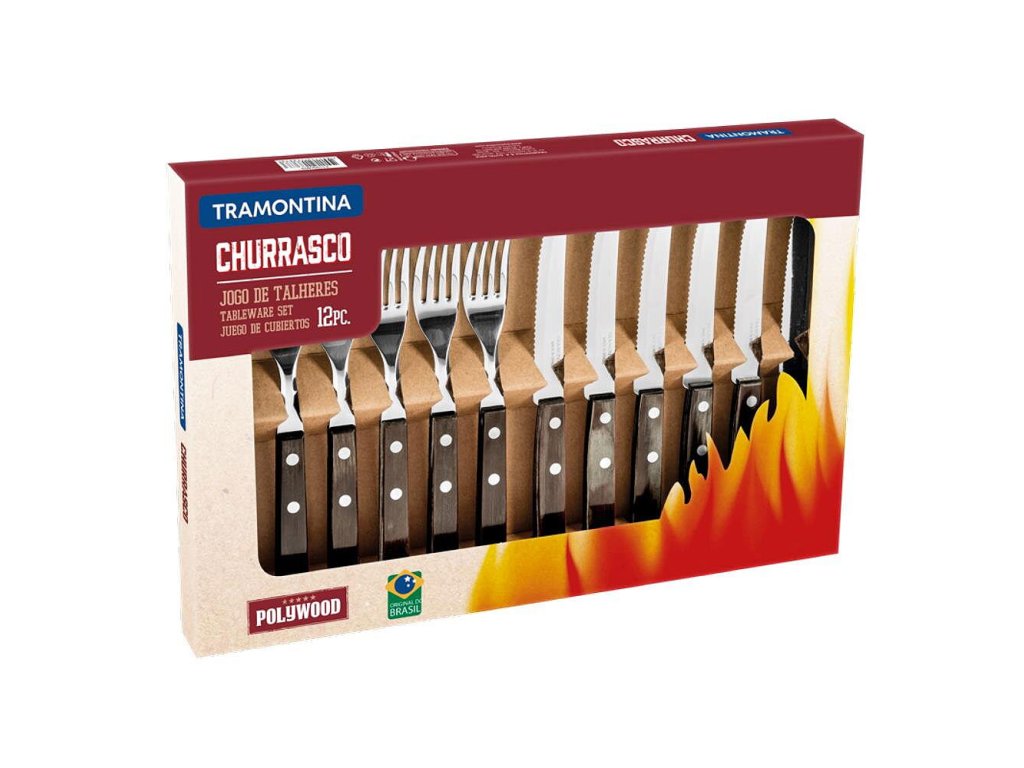 Súprava steakových príborov Tramontina Churrasco obsahuje 12 kusov – 6 steakových nožov a 6 vidličiek, ktoré sú ideálnou voľbou na každodenné stolovanie aj víkendové grilovanie. Príbory sú vyrobené z kvalitnej nerezovej ocele a doplnené o drevené rukoväte z borovice v tmavom odtieni, ktoré zabezpečujú príjemný úchop a tradičný churrasco vzhľad.