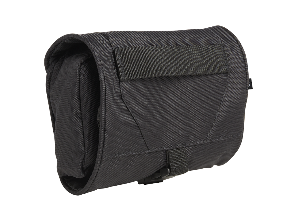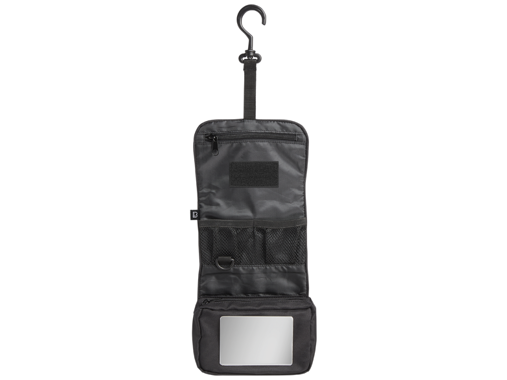 robust 600DEN polyester material / 1 zipper compartment / 2 mesh-pockets with elastic band / 1 large fold-out compartment with zip (16 cm x 10 cm) / detachable, shatterproof mirror / additional hook and loop surface for the mirror / rotating plastic hook for hanging up / buckle lockable / Hand carrying loop / D-Ring / height 13 cm x breadth 16 cm x depth 5 cm - height 36 cm x breadth 16 cm x depth 3 cm (unfolded)