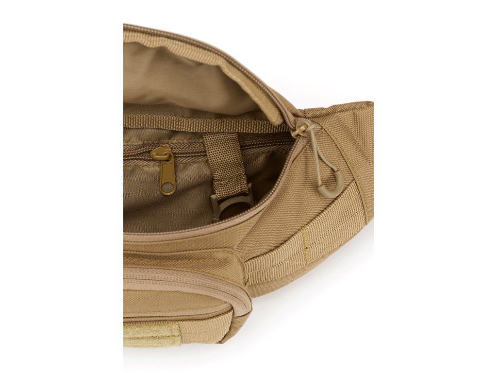 large main compartment with zippered inner pocket and key hooks / front pocket with additional compartment / hook and loop back pocket / lid compartment with elastic cross strap / MOLLE loops / MOLLE loops with hook and loop surface / zippers with C ring / durable 600D Polyester / adjustable waist belt / circumference max: 170 cm